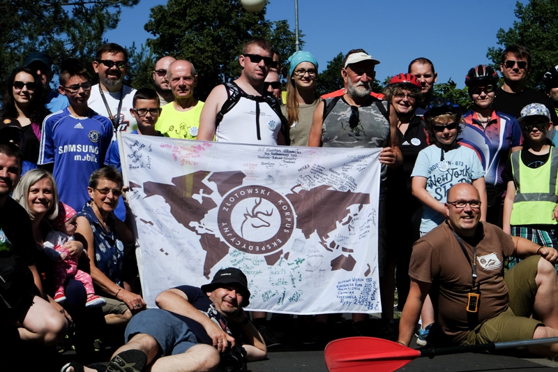 Piotr chętnie by mi pokazał kąpieliska, ale nie ma czasu! Nad jeziorem odbywa się kurs survivalu, montuje się wystawa fotograficzna, na drzewie już umocowano platformy do spania… Wszystko trzeba skontrolować, a potem ustawić kocioł zanim na mecie pojawią się pierwsi zawodnicy, musi zamatować wielki kocioł, w którym uwarzą zupę. Piotr ma pełne ręce roboty! -Ten kocioł, to nasza tradycja. – organizujemy konkurs na zupę i kto go wygra w następnym roku musi wszystkim coś ugotować! Później będzie twój pokaz zdjęć, zamontowanie na jeziorze baby z geocachem i uroczyste przykręcenie ibombo – czyli samo-stojącej, bezpłatnej stacji do naprawy rowerów. Dokona tego burmistrz miasta, prywatnie – członek Korpusu.