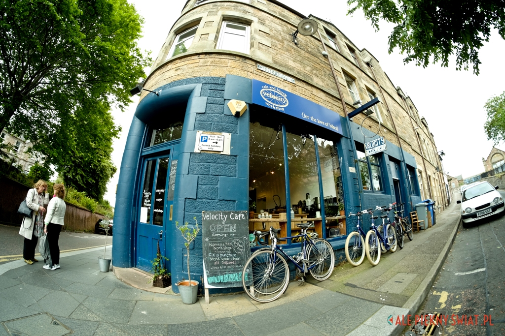 Nie znam bardziej rowerowej kawiarni od Velocity Cafe. Przed drzwiami stoi cała masa rowerów, w oknie wyścigówka, a w środku same pozytywne świry. Rowerowe. Czy ja się też do nich zaliczam? Jeszcze przedwczoraj byłam w stanie zrobić każdą głupotę na hasło: „co, ja nie dam rady?”. Przez ostatnie kilka dni za tymi właśnie słowami na ustach osadzałam sakwy na bagażniku i ruszałam w drogę przez szkockie górki i pagórki w kierunku na Orkady. Ale wczoraj droga dała mi w kość. Tak, że dziś jak zbity pies siedzę w Velocity Cafe, tępo patrzę na jeden rower w oknie, kolejne za oknem, na rower bambusowy nie patrzę, bo chyba mam go dość, szczególnie siodełka… Na szczęście w miejscu, które powstało z miłości dla rowerów, kocha się wszystkie rowery łącznie z ich właścicielami. Dlatego do mojego stolika podeszła Ferga.